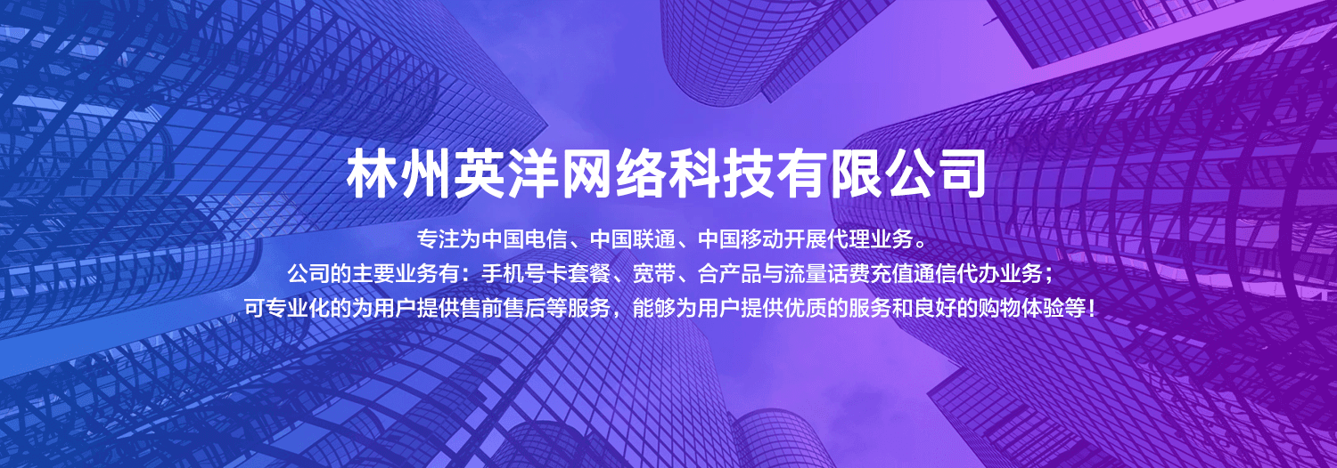 林州英洋网络科技有限公司,自成立时起一直专注为中国电信、中国联通、中国移动开展代理业务。公司的主要业务有:手机号卡套餐、宽带、融合产品与流量话费充值通信代办业务;可专业化的为用户提供售前售后等服务,能够为用户提供优质的服务和良好的购物体验等。我司在线上销售渠道经营通信业务产品,已经有了多年的经验,包括号卡套餐、宽带办理、融合套餐、老用户维系、流量充值、话费充值等。